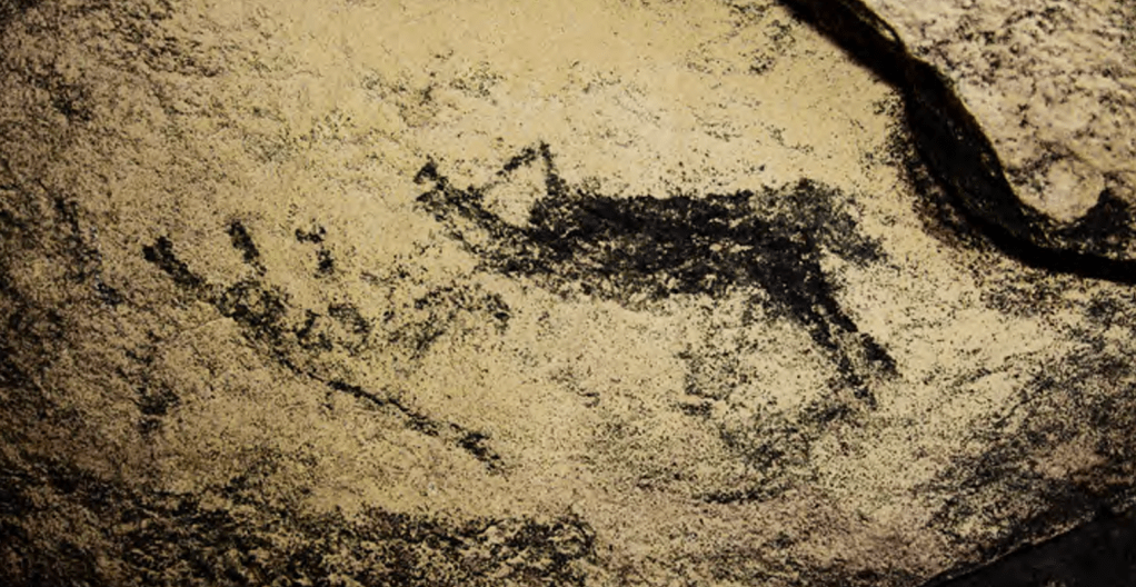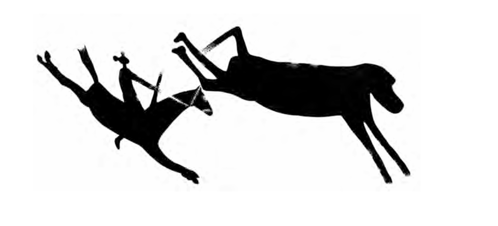Rock art from a Drakensberg cave, depicting a disproportionately large and powerful baboon fleeing from a small horse and rider, in a 19th-century colonial-era scene. The contrast in scale is interpreted as symbolic. (Photo: Sam Challis, Rock Art Research Institute)